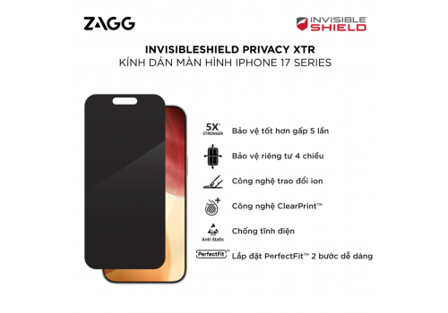 Kính dán bảo vệ màn hình ZAGG InvisibleShield Privacy XTR thiết kế dành riêng cho iPhone 17 series: iPhone 17, iPhone 17 Air, iPhone 17 Pro, iPhone 17 Pro Max để đảm bảo kính dán vừa vặn, che phủ toàn bộ màn hình, hạn chế va đập, hư hỏng góc màn hình.