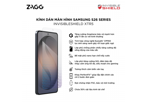 Kính dán bảo vệ màn hình ZAGG InvisibleShield XTR5 thiết kế dành cho Samsung S26 series: Samsung S26, Samsung S26+, Samsung S26 Ultra để đảm bảo kính dán vừa vặn, che phủ toàn bộ màn hình, hạn chế va đập, hư hỏng góc màn hình.