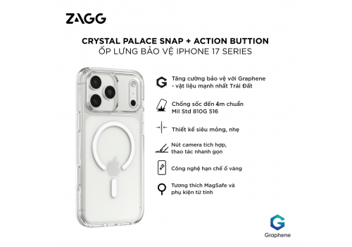 Với những điểm nổi bật từ thiết kế chống sốc, chống trầy xước đến vẻ đẹp thẩm mỹ cao, ZAGG Crystal Palace Snap (kèm Camera Button) là chiếc ốp lưng hoàn hảo, thanh lịch bảo vệ điện thoại iPhone 17 của bạn toàn diện. ZAGG - Thương hiệu phụ kiện uy tín từ Mỹ.