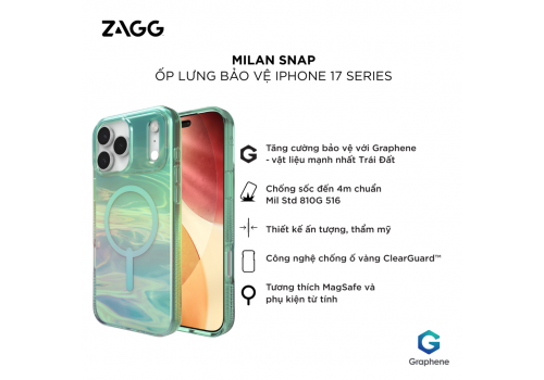Sở dĩ ốp lưng ZAGG Milan Snap có khả năng bảo vệ điện thoại khỏi va đập đến 4m là nhờ vào vật liệu bảo vệ mới Graphene: một trong những vật liệu bền nhất Trái Đất với sức mạnh bảo vệ bền bỉ, cứng hơn kim cương, đàn hồi hơn cao su và bền hơn thép tới 200 lần. Có khả năng phân tán nhiệt lượng: Graphene là một trong những vật liệu nhân tạo dẫn điện tốt nhất trên thế giới. Những nhà cách tân hàng đầu trong ngành sử dụng Graphene: hàng không, hàng không vũ trụ, thể thao chuyên nghiệp,...