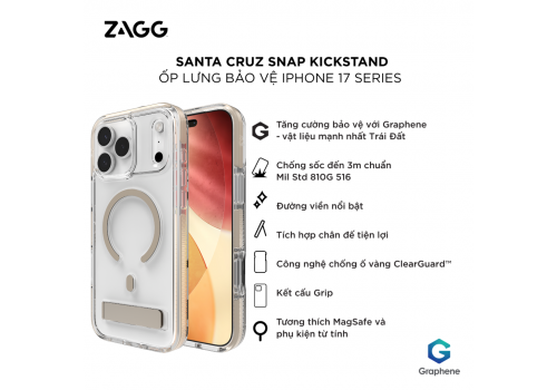 Khi tìm kiếm một chiếc ốp lưng vừa chắc chắn vừa đẹp mắt, ZAGG Santa Cruz Snap Kickstand chính là lựa chọn hoàn hảo cho iPhone 17 series. Được tăng cường với Graphene – vật liệu mạnh nhất Trái Đất – cùng khả năng chống sốc chuẩn 4m, Santa Cruz Snap mang đến sự bảo vệ toàn diện mà vẫn giữ trọn vẹn nét thanh lịch, trẻ trung cho chiếc iPhone của bạn.